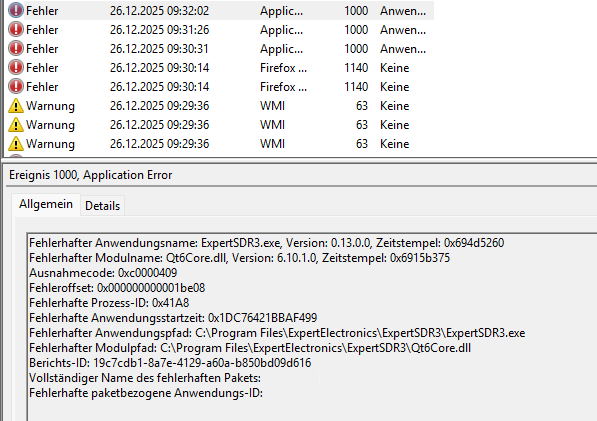 Heute Morgen am 26.12.2025 die Meldung: ExpertSDR3 Version 1.1.5 ist da. Sofort installiert, aber … nichts. Das Programm startete nicht. Keine Fehlermeldung, kein erkennbarer Prozess im Task-Manager.